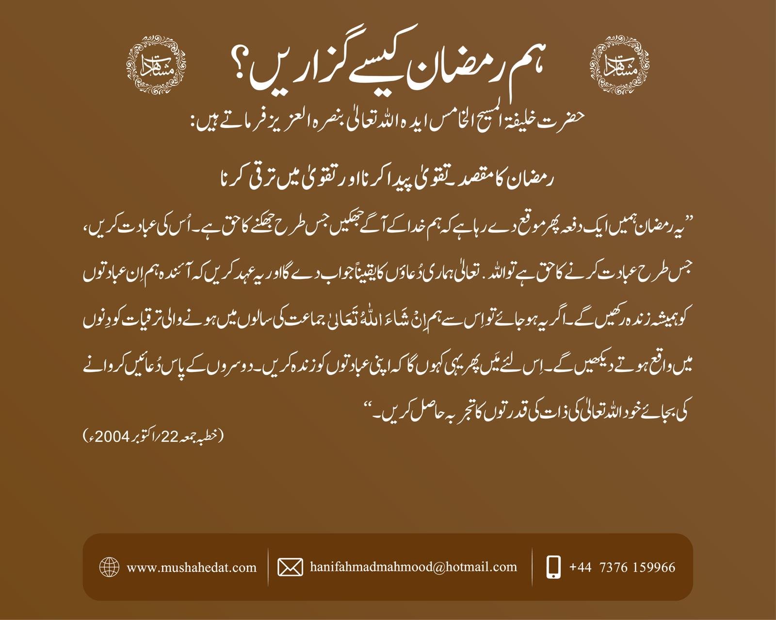 مزید پڑھیں30تقاریربابت رمضان المبارک 2025ء (جلداول)